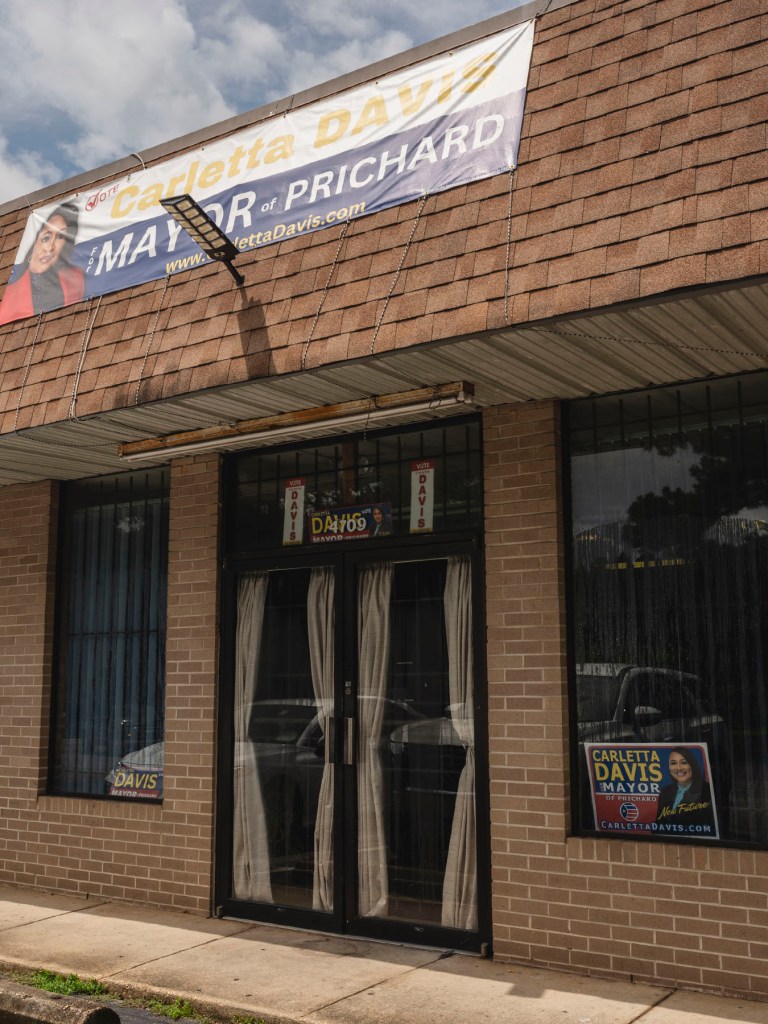 Davis’ campaign office is located off one of the main roads through town, sandwiched between a life coach’s storefront and a motorcycle club’s meeting space. A large vinyl banner stretches across the top of the door with a commanding picture of Davis in a red blazer, and the words “Vote Carletta Davis, Mayor of Prichard.”
